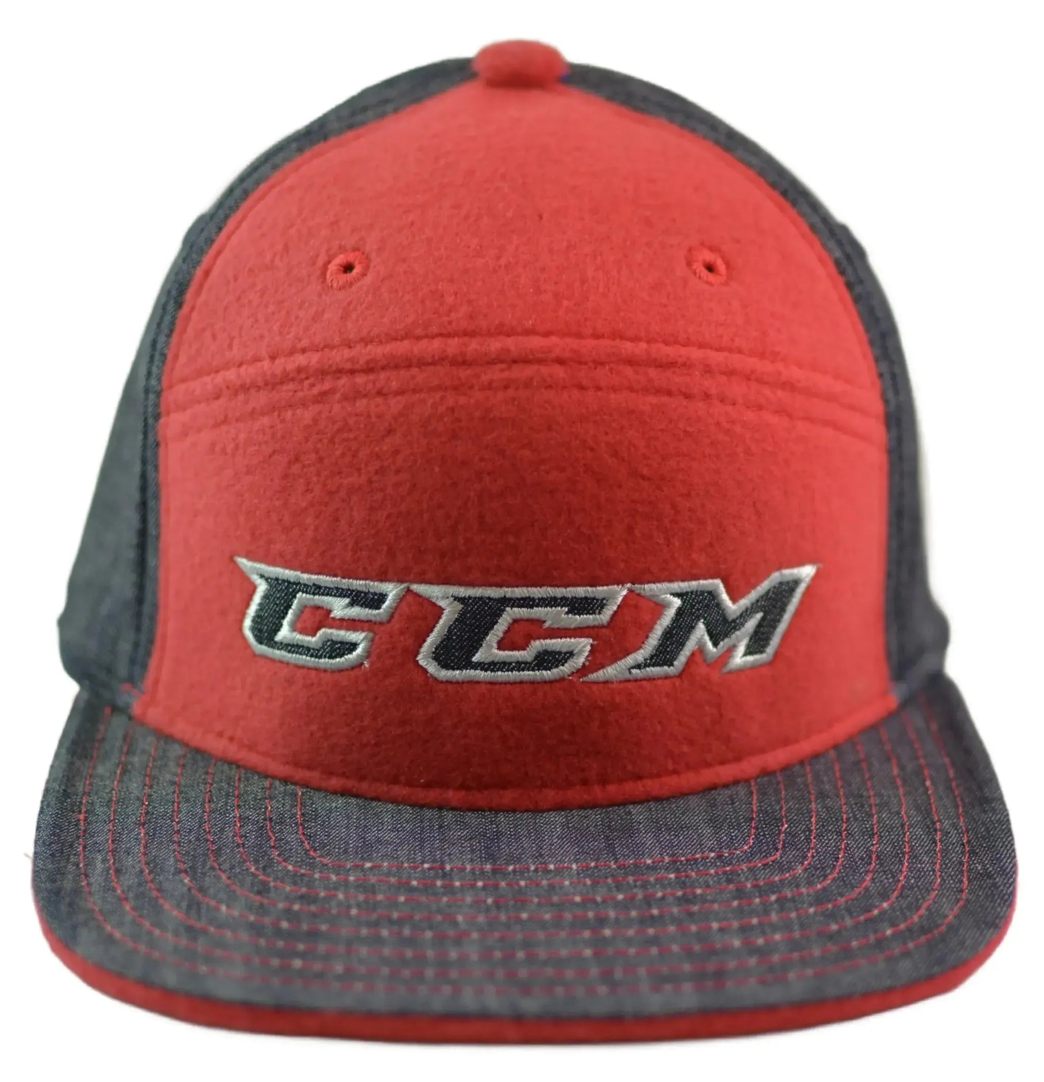 This CCM Hockey Lifestyle Apparel 5 Panel Camper Hat is a must-have for any hockey lover! The hat features a stylish blue and red 2 tone solid pattern with a denim and flannel material that adds a touch of class to your casual wardrobe. The CCM logo on the front of the hat is a great way to show off your love for the sport. The hat is designed to fit comfortably thanks to its stretch fit adjustment type, making it perfect for a day out or a casual night with friends. This hat is perfect for anyone who loves the style and comfort of a camper/racer hat. Add this to your collection of hats today!