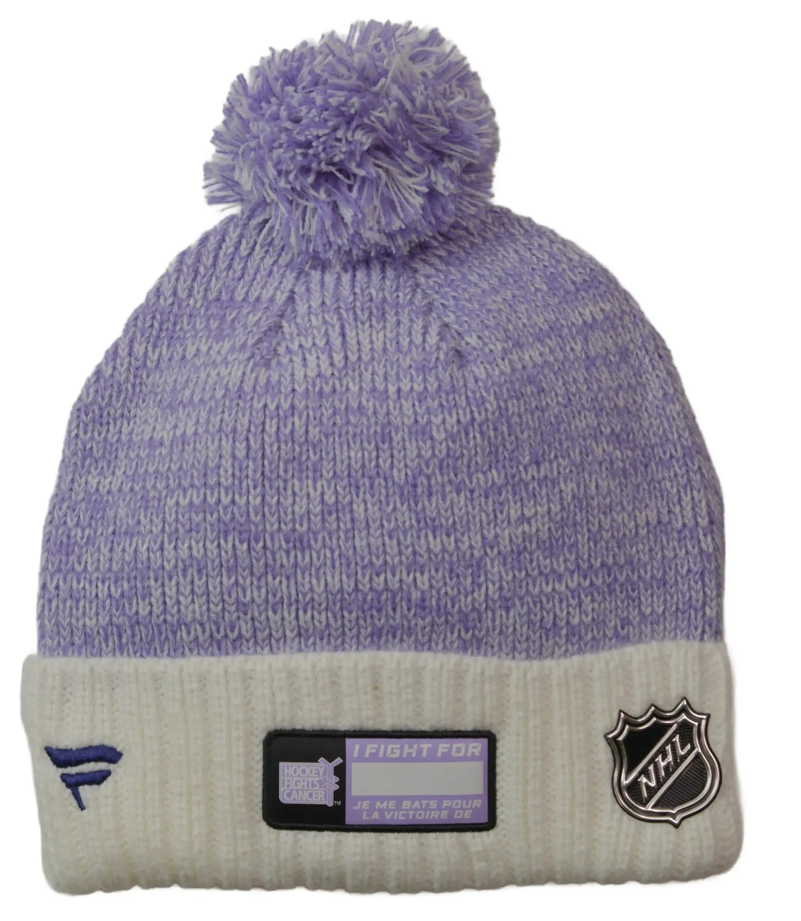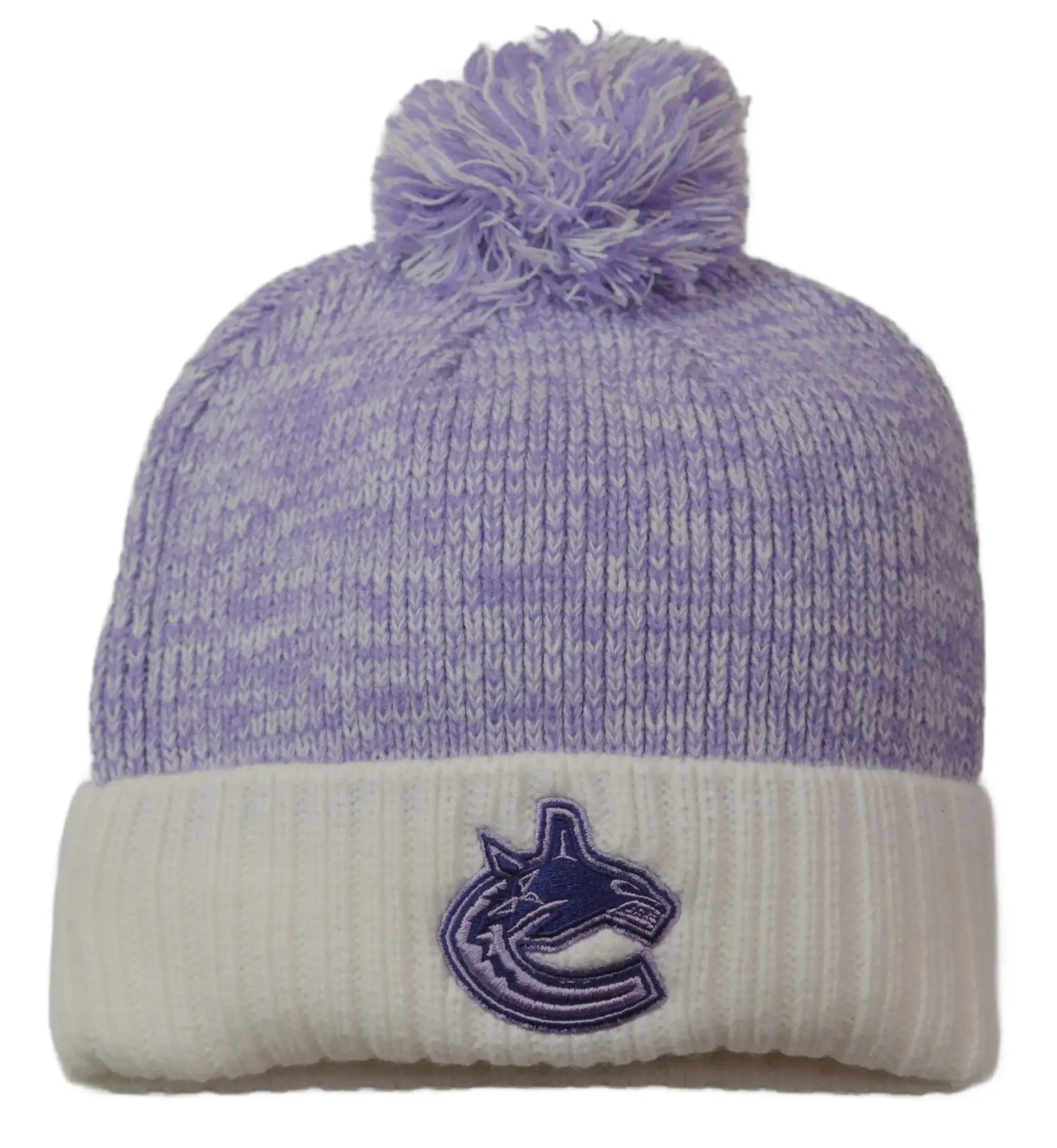 Show your support on and off the ice with this Vancouver Canucks Hockey Fights Cancer knit pom beanie by Fanatics. Designed in the league’s signature lavender tones, this cuffed winter hat features a marled purple knit crown, soft cream cuff, and embroidered Canucks logo front and center.